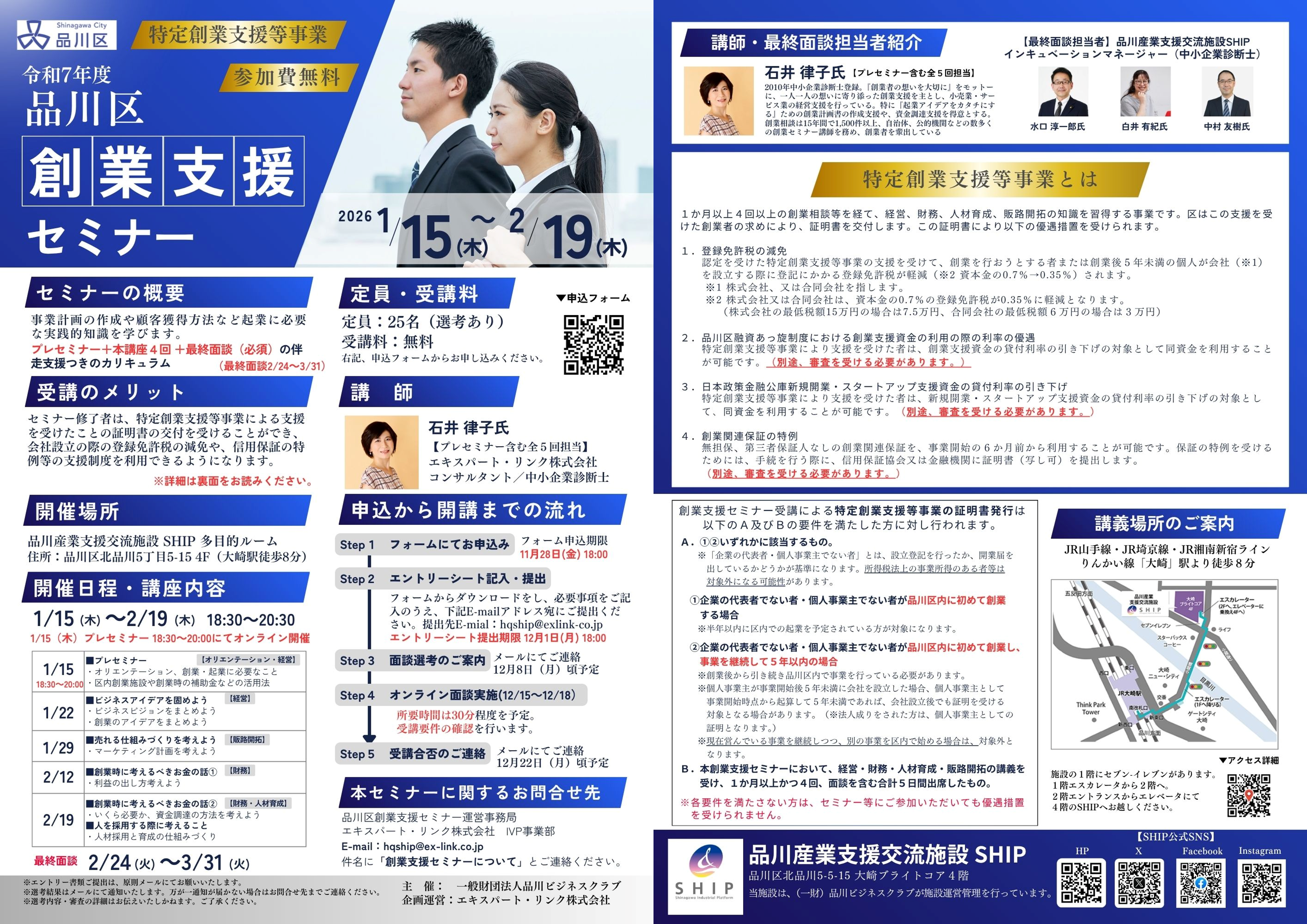 2026年1月から開催するセミナーは、品川区内にて初めて創業を予定している方、区内で初めて創業間もない方を対象に、創業に必要な基礎知識から事業計画策定までを体系的に学べる内容となっております。